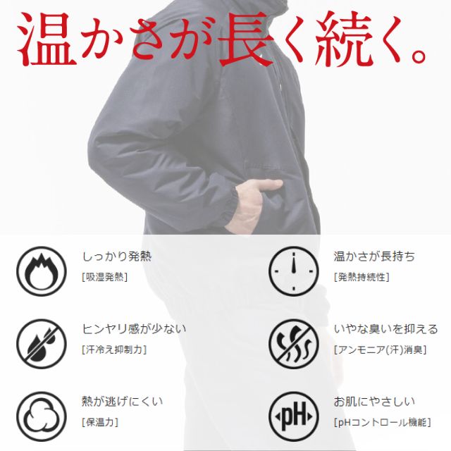 体から出る水分を吸収し発熱。温かさが長持ちし、汗冷えやニオイも抑制。快適な着心地をキープします。