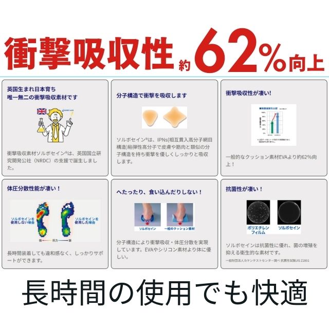 ・衝撃吸収ソルボセイン:医療分野でも使われる唯一無二の素材で、着地衝撃を吸収。