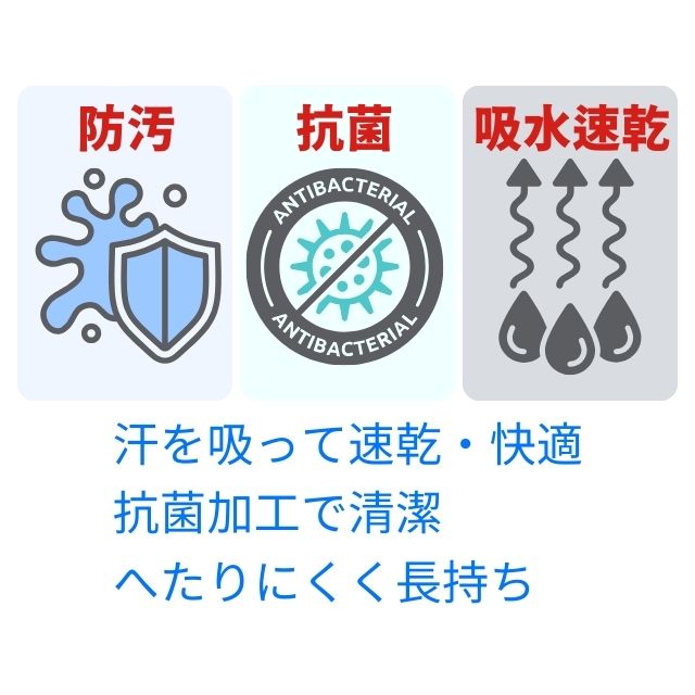 ・吸汗速乾ハニカムメッシュ生地:汗を素早く吸収・乾燥。防汚・抗菌加工で清潔。